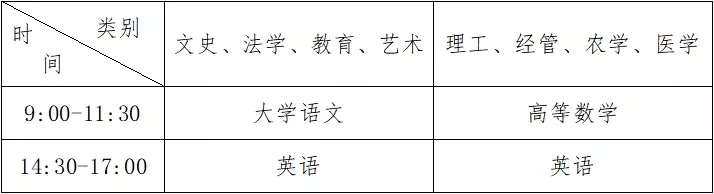 本次考试将于2022年3月26日举行,考点设在设区市。文史、法学、教育、艺术四个类别考试科目为大学语文、英语;理工、经管、农学、医学四个类别考试科目为高等数学、英语,各科目满分均为150分。具体各类别科目考试时间表如下: